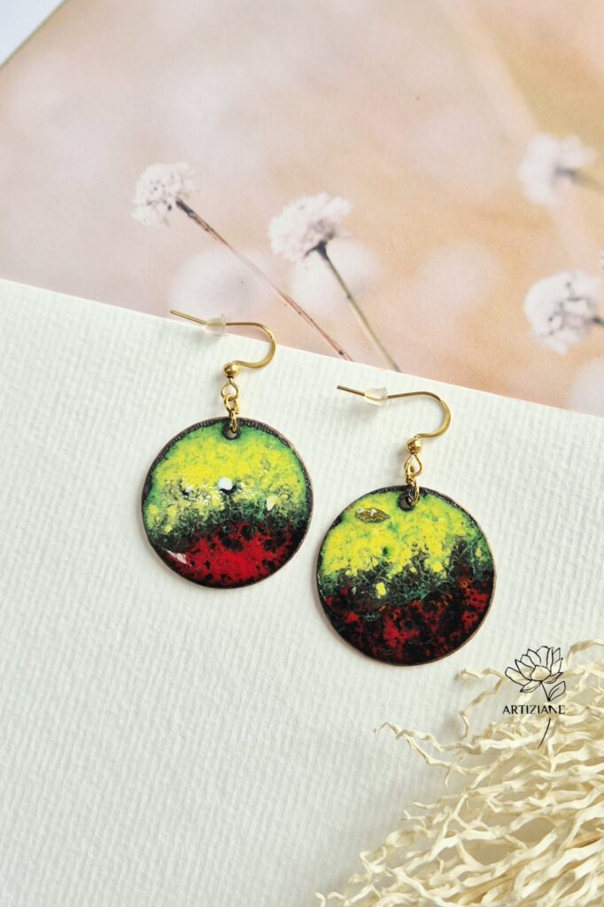De la cueillette des fleurs jusqu’à leur encapsulage, chaque étape est réalisée par mes soins avec patience et minutie, rendant chaque création réellement unique. Je façonne aussi des bijoux en émail sur cuivre, un art où le feu joue un rôle essentiel : à haute température, l’émail fond, se fixe au métal et révèle des couleurs profondes et vibrantes. Un travail de précision et de chaleur qui donne naissance à des bijoux audacieux, vivants et durables.